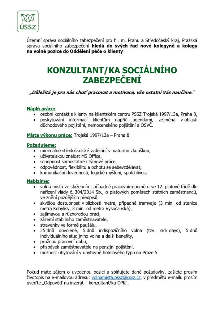 ÚSSZ pro hl.m. Prahu a Středočeský kraj, Pražská správa sociálního zabezpečení hledá do svých řad nové kolegy a kolegyně na volné pozice do Oddělení péče o klienty.
