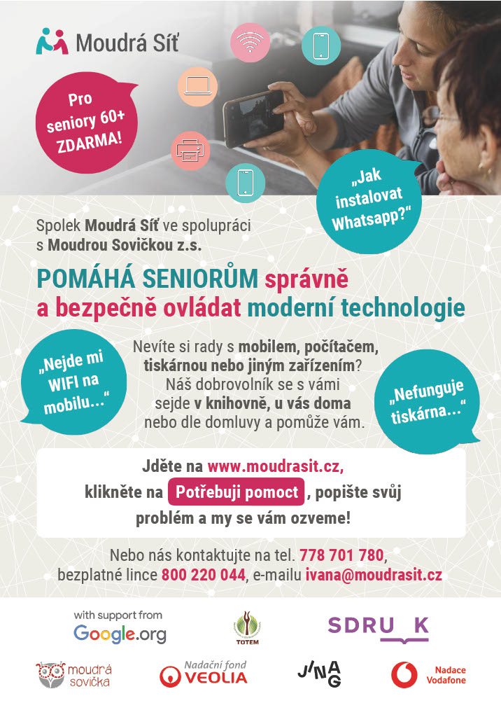 Spolek Moudrá Síť nabízí seniorům pomoc s ovládáním moderních technologií. Naši dobrovolníci jsou připraveni poskytnout asistenci v knihovně, u vás doma nebo dle domluvy. Pokud máte problém s mobilem, počítačem či jiným zařízením, neváhejte nás kontaktovat. Všechny služby jsou zdarma pro osoby starší 60 let. Pro více informací navštivte naše webové stránky www.moudrasit.cz nebo nás kontaktujte na tel. 778 701 780, bezplatné lince 800 220 044, e-mailu ivana@moudrasit.cz.