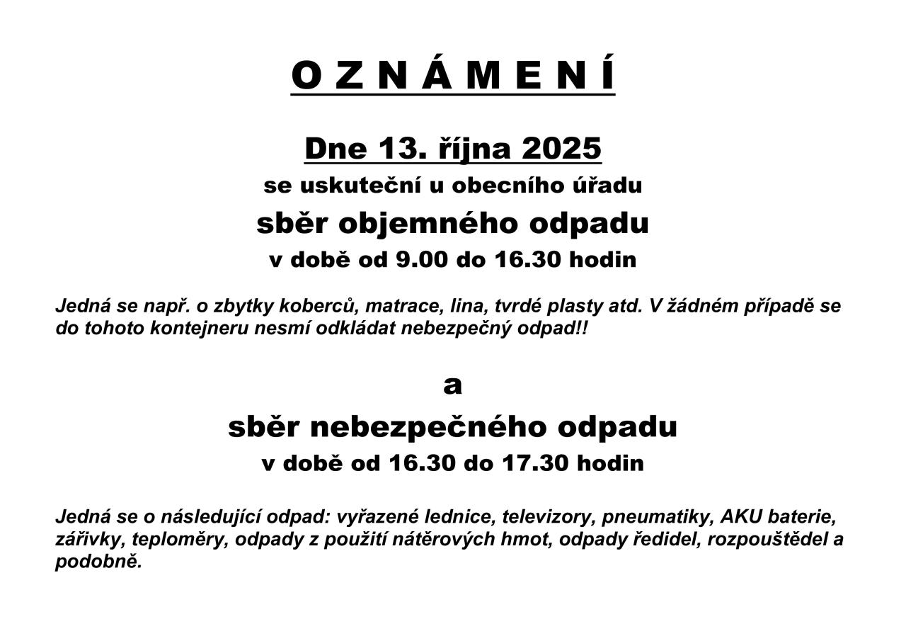 Dne 13. října 2025 se u OÚ uskuteční sběr objemného a následně nebezpečného odpadu. Sběr objemného odpadu proběhne od 9.00 do 16.30 hodin. Můžete přinést zbytky koberců, matrace, lina, tvrdé plasty apod. Do kontejneru pro objemný odpad nesmí být odkládán nebezpečný odpad!! Ten bude možné odevzdat u OÚ od 16.30 do 17.30 hodin. Do nebezpečného odpadu patří vyřazené lednice, televizory, pneumatiky, AKU baterie, zářivky, teploměry, ředidla, rozpouštědla apod.