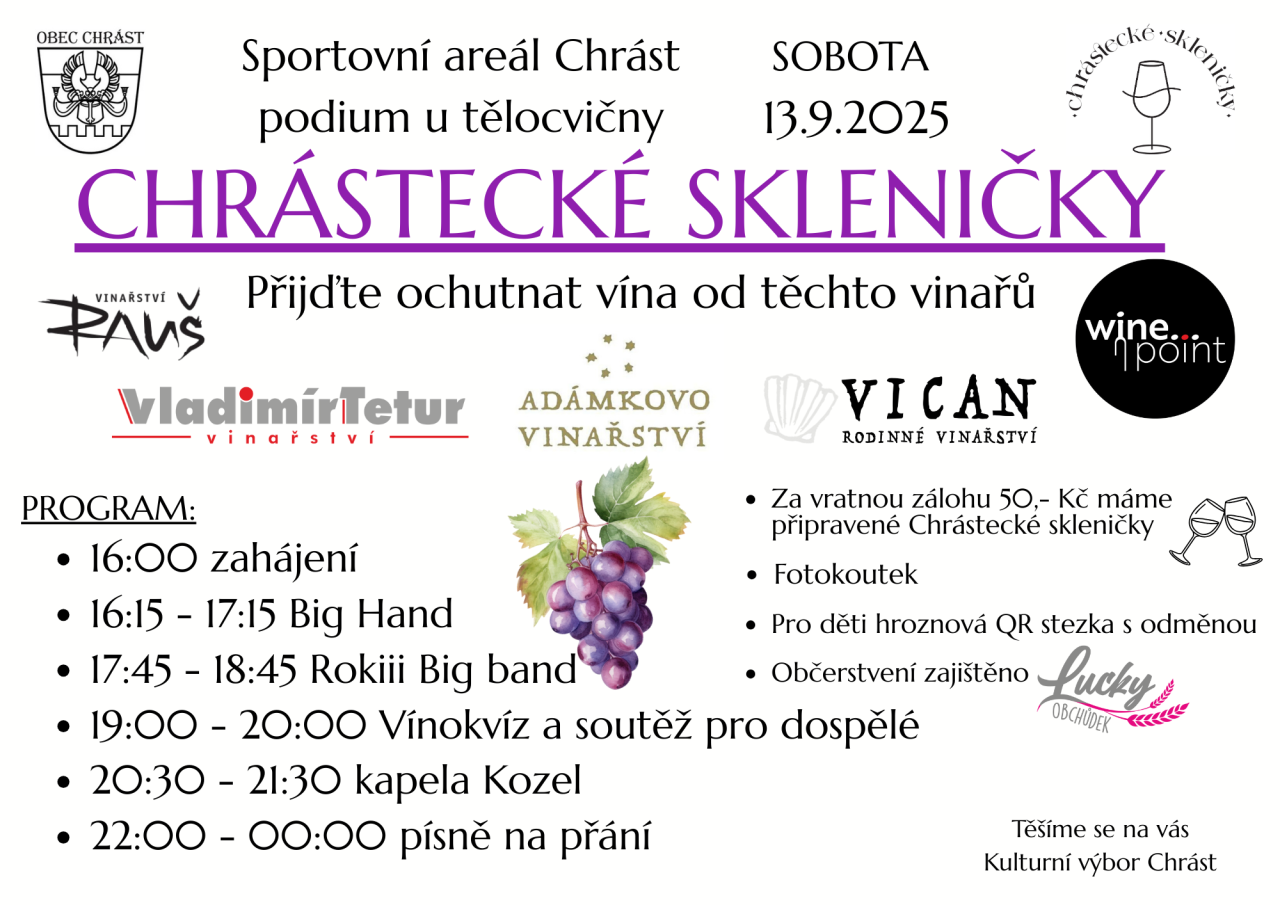 Obec Chrást vás srdečně zve na akci Chrástecké skleničky 2025, která se uskuteční 13. září 2025 ve sportovním areálu Chrást. Na programu je ochutnávka vín od místních vinařů, živá hudba v podání Big Hand a Kozel, a také soutěže pro dospělé a děti.