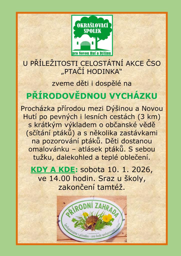 OKRAŠLOVACÍ SPOLEK pro Novou Huť a Dýšinou Vás zve v sobotu 10. ledna od 14:00 hodin U PŘÍLEŽITOSTI CELOSTÁTNÍ AKCE ČSO „PTAČÍ HODINKA" na procházku přírodou mezi Dýšinou a Novou Hutí po pevných i lesních cestách (3 km) s krátkým výkladem o občanské vědě (sčítání ptáků) a s několika zastávkami na pozorování ptáků.