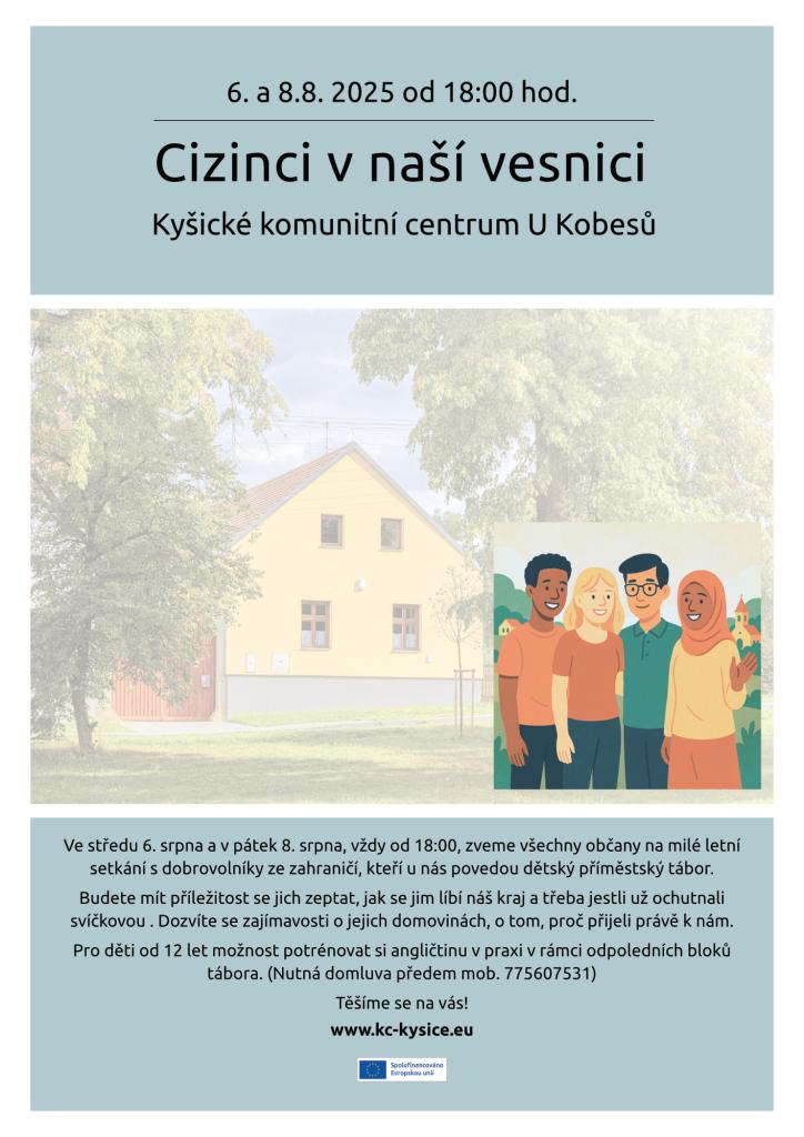 Zveme Vás na milé setkání s dobrovolníky ze zahraničí, kteří u nás povedou dětský příměstský tábor. Setkání se konají ve středu 6. srpna a v pátek 8. srpna, vždy od 18 hodin. Budete mít možnost se dobrovolníků zeptat například, jak se jim líbí náš kraj a proč se vydali právě k nám.
