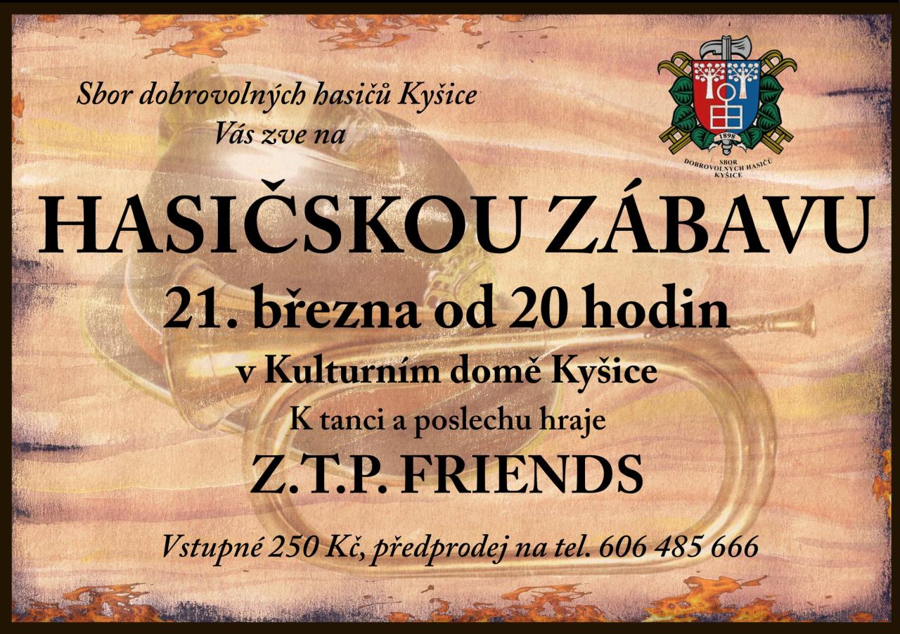 Sbor dobrovolných hasičů Kyšice Vás zve na Hasičskou zábavu která se koná 21.března od 20:00 hodin v Kulturním domě v Kyšicích. K tanci a poslechu hraje Z.T.P. FRIENDS. Vstupné je 250 Kč, předprodej na tel. 606 485 666
