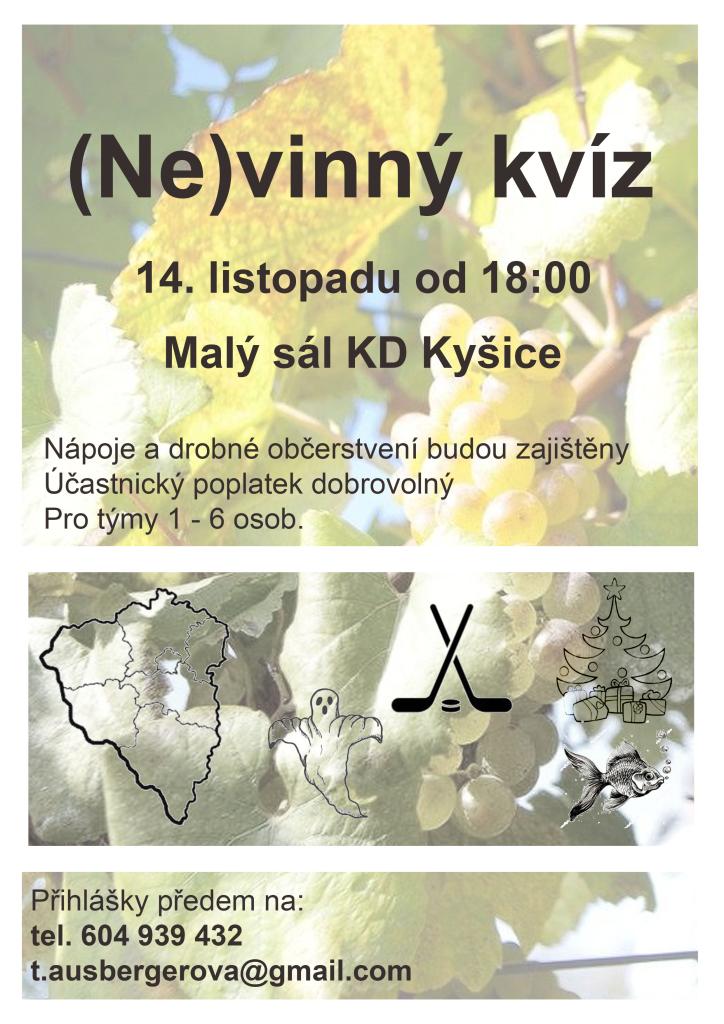 Zveme vás na (Ne)vinný kvíz, který se koná 14. listopadu od 18:00 v malém sále KD Kyšice. Tato akce je určena pro týmy složené 1-6 osob. Nápoje i drobné občerstvení bude zajištěno, účastnický poplatek je dobrovolný. Týmy prosím přihlašte předem na tel. 604 939 432 nebo emailu t.ausbergerova@gmail.com.