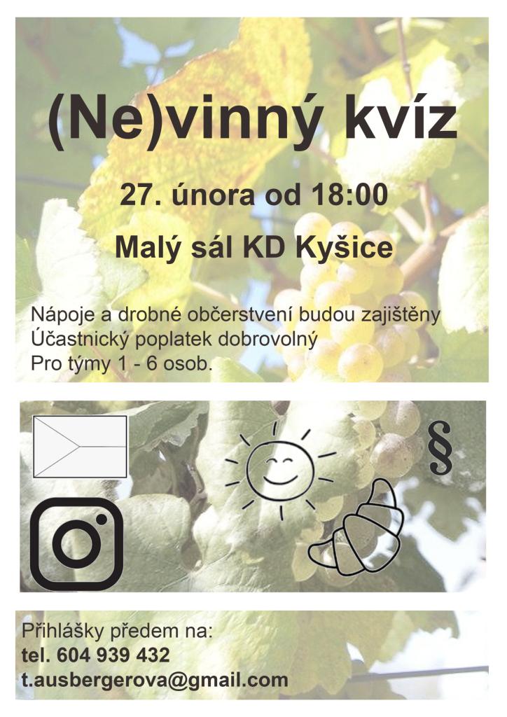 Zveme vás na (Ne)vinný kvíz, který se koná 27. února od 18:00 v malém sále KD Kyšice. Tato akce je určena pro týmy složené 1-6 osob. Nápoje i drobné občerstvení bude zajištěno, účastnický poplatek je dobrovolný. Týmy prosím přihlašte předem na tel. 604 939 432 nebo emailu t.ausbergerova@gmail.com.