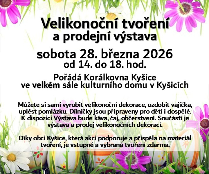 Přijďte na Velikonoční tvoření a prodejní výstavu, které se uskuteční v sobotu 23. března 2026 od 14:00 do 18:00 ve velkém sále kulturního domu v Kyšicích. Akci pořádá Korálkovna s podporou obce Kyšice. Vstup a vybraná tvoření jsou zdarma.