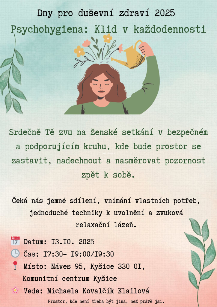Zveme Vás na ženské setkání zaměřené na duševní zdraví s tématem Psychohygiena: Klid v každodennosti, které se uskuteční 13. října 2025 v Komunitním centru Kyšice. Během setkání bude prostor pro jemné sdílení a vnímání vlastních potřeb. Na programu budou jednoduché techniky k uvolnění a zvuková relaxační lázeň, které přispějí k obnovení vnitřní pohody. Přijďte do bezpečného a podporujícího prostředí, kde můžete být sama sebou.